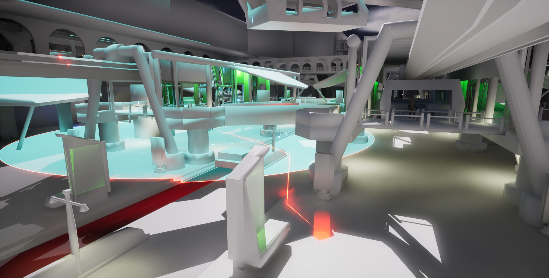The core blueprint was the monorail system itself - this needed to be fleshed out as the level was going to be built around it. Players needed to be able to board the train and quickly move around the level. This required the majority of balancing as I didn’t want players feeling like they were wasting turns by being stuck in a box.