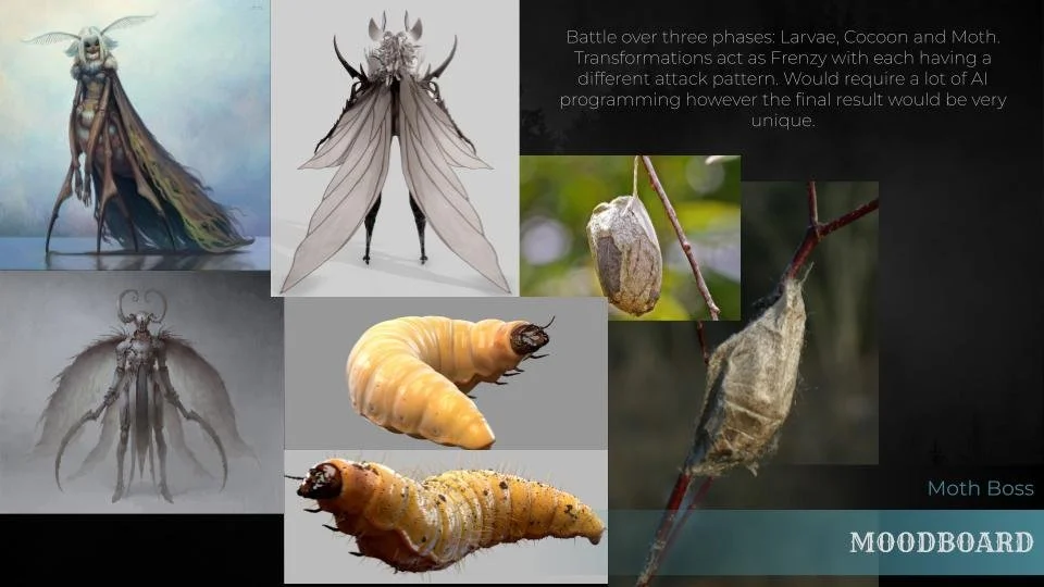 Each boss tends to have a compound that is particularly attached to them, for example The Butcher has The Slaughterhouse. For that reason I wanted to introduce the new map (that this compound would presumably be apart of) with a new boss and tie the whole addition together. As part of the design I broke down the existing boss mechanics and introduced new mechanics which feel unique. In this case, the moth boss interacts with the passive lanterns around the compound which players could turn off to make the fight easier.
