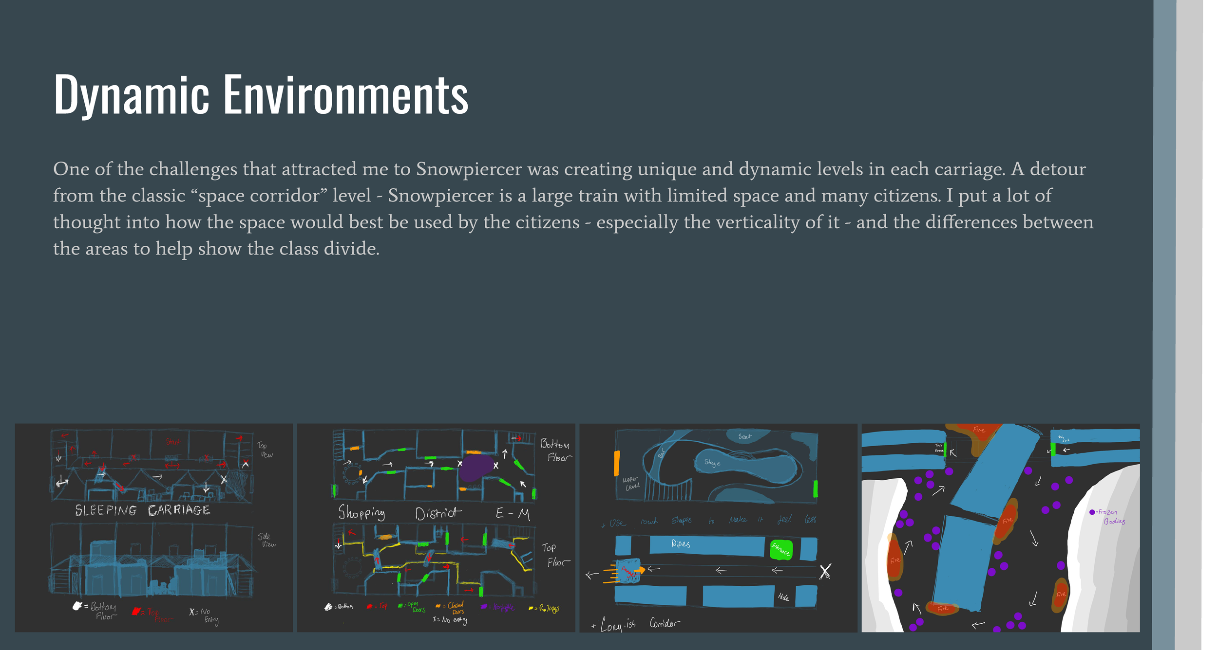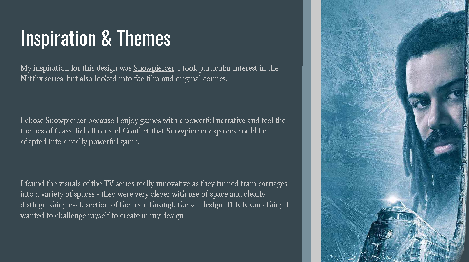Snowpiercer was a project for a module where I had to create a level based on a TV Show or Movie. I selected Snowpiercer as my inspiration, as I felt the design of the carriages would be a good challenge for gameplay and level design.